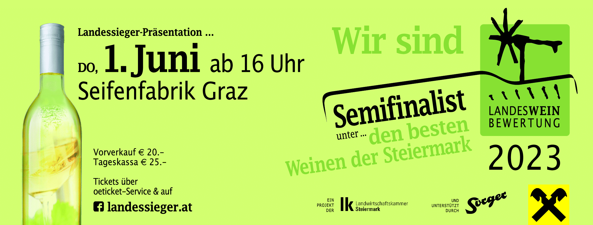 Eine leuchtend grüne Werbung für eine Weinveranstaltung am 1. Juni in der Seifenfabrik Graz. Sie zeigt eine Flasche Weißwein und einen Text, der die Veranstaltung und ihren Status als Halbfinalist der Landesweinbewertung 2023 ankündigt.