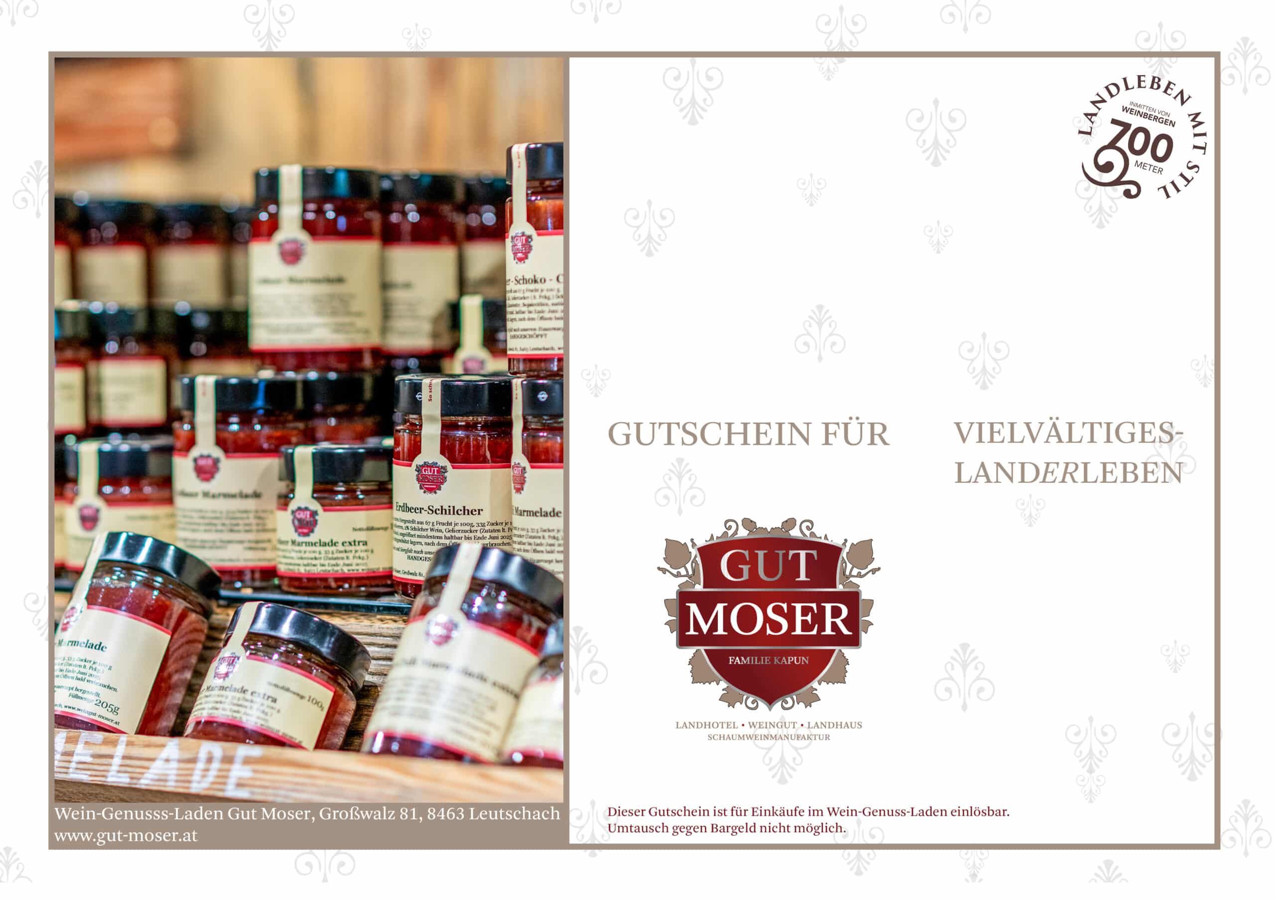Schenken Sie südsteirischen Genuss in Form eines Wertgutscheines für unsere Produkte vom Weingut Moser. Unsere Gutscheine können im Onlineshop sowie vor Ort eingelöst werden.
