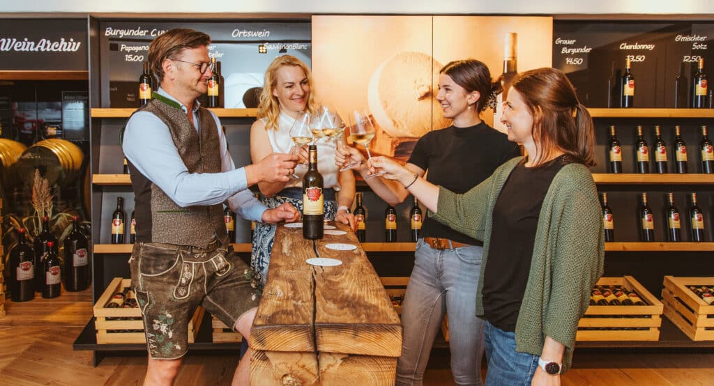 Vier Personen lächeln und stoßen mit Weingläsern an einem Holztisch in einem urigen Weinladen an. Dahinter quellen die Regale über vor Weinflaschen. Eine Person fällt in traditioneller Kleidung auf und verleiht der gemütlichen Runde einen Hauch von kulturellem Flair.