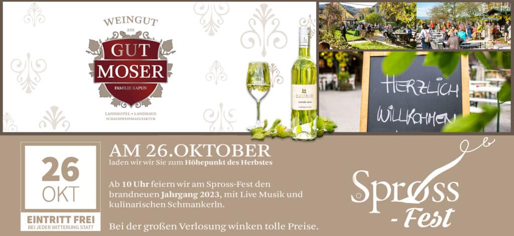 Flyer zum Sproß-Fest am 26. Oktober. Er zeigt Weinmotive, das „Gut Moser“-Logo und Aufschriften wie „Herzlich Willkommen“. Live-Musik und kulinarische Leckerbissen inklusive. Eintritt frei.