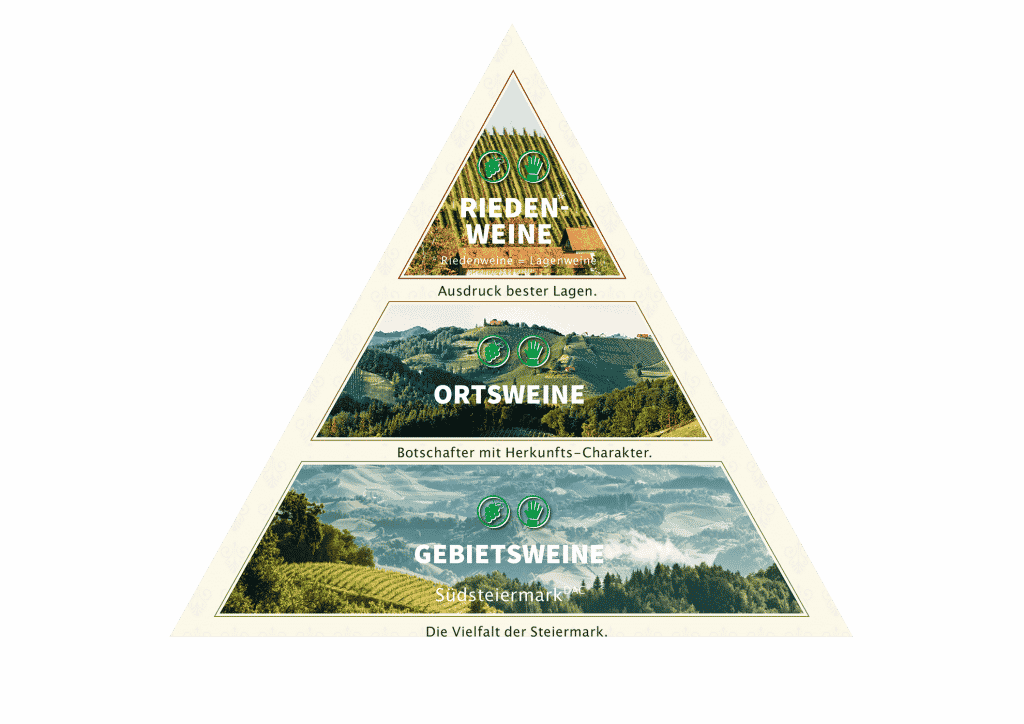 Eine dreieckige Infografik präsentiert drei Weinkategorien. Oben sind „Riedenweine“ mit Weinbergbildern abgebildet, in der Mitte „Ortsweine“ vor malerischer Landschaft und unten „Gebietsweine“ vor Bergpanorama – alles elegant in deutscher Sprache beschriftet.
